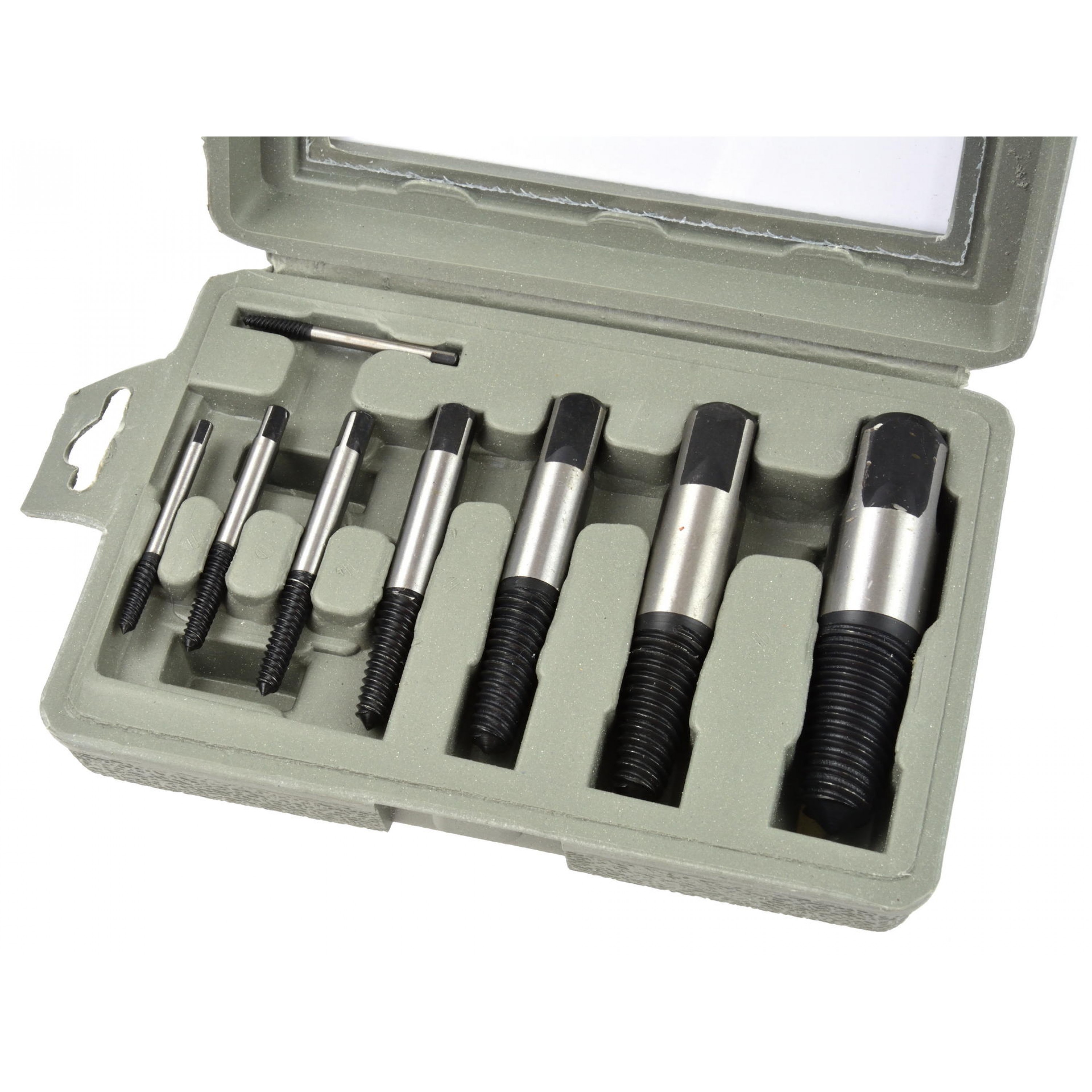 Un set de 8 extractoare de diferite dimensiuni pentru îndepărtarea șuruburilor, șuruburilor, șuruburilor rupte sau deteriorate în alt mod.